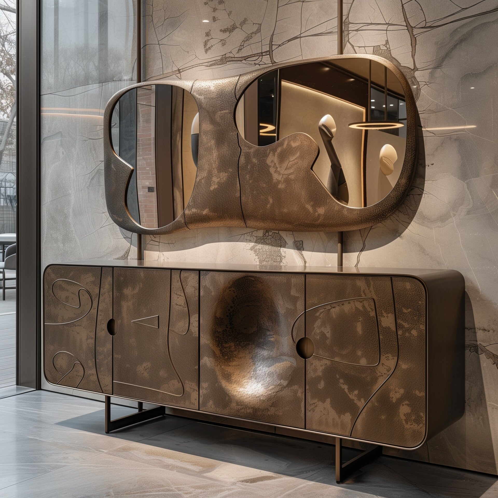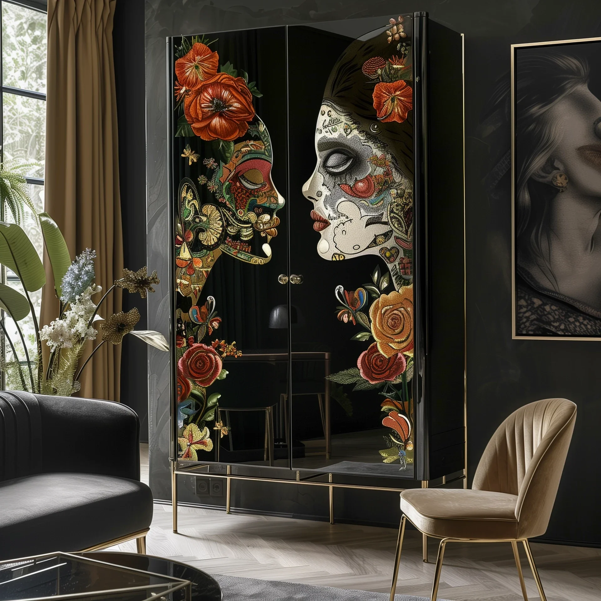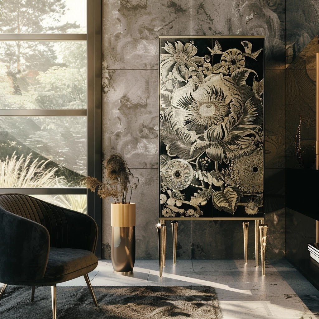 The concept of combining furniture and tattoo art on brass cabinet fronts is an innovative idea that allows the integration of tattoo designs, often personal and meaningful, directly onto furniture surfaces. This approach enables owners to personalize their furniture in a unique and expressive way. Here is a detailed description of this concept: