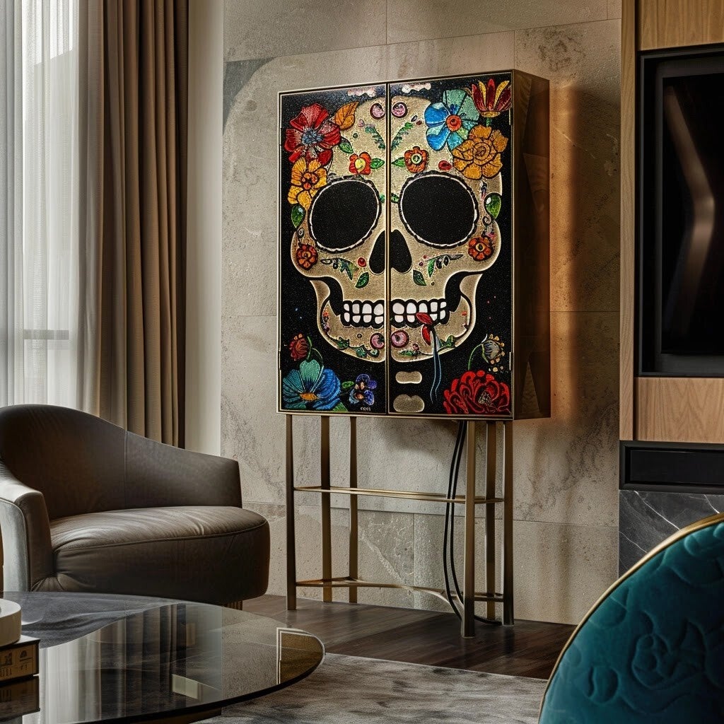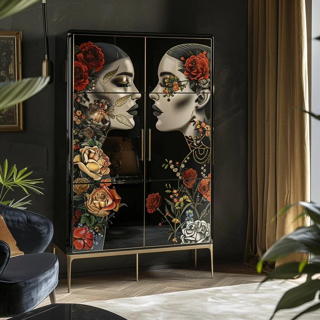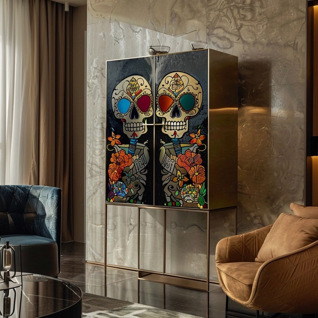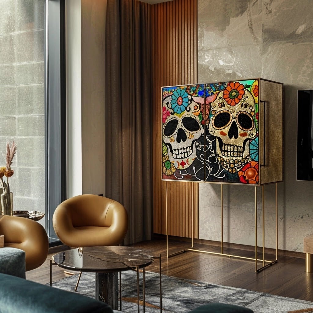 During an evening with friends, imagine gathering near a brass bar cabinet decorated with your personal tattoo designs. While serving a glass of wine or a cocktail, you can share the story and significance of these designs with your guests. This context makes the furniture not only functional but also elements of storytelling and cultural and personal exchange.